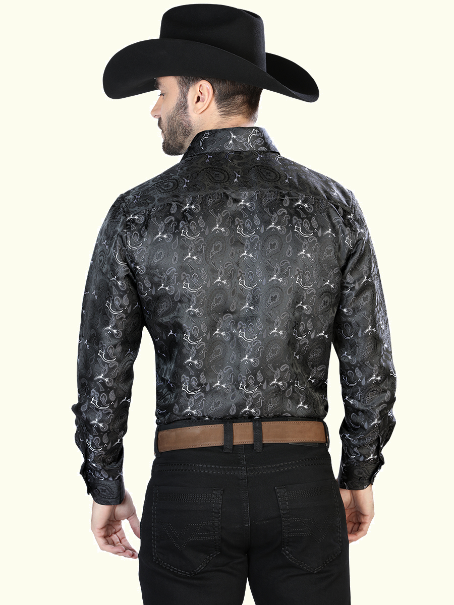 La Sombra Elegante es la definición de presencia con distinción. Esta camisa de manga larga, confeccionada en 100% microfibra negra con detalles en patrón paisley satinado, está diseñada para quienes saben que el estilo vaquero también puede ser sobrio y sofisticado. Su textura ligera y su caída impecable la hacen ideal para ocasiones especiales, noches de rodeo o eventos donde el negro habla por ti.